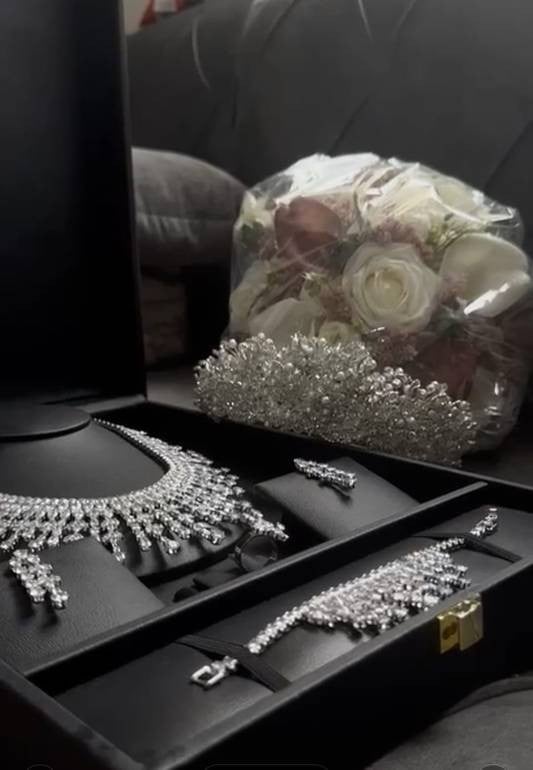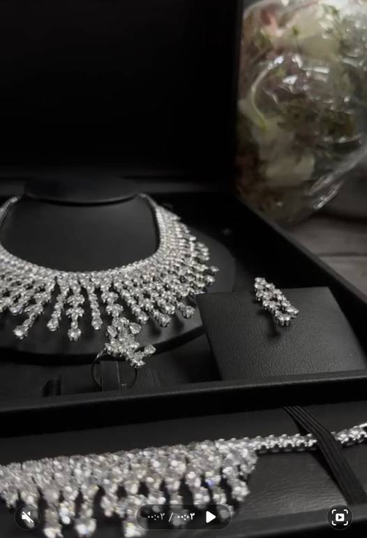 طقم مصنع من الزراكون عالي الجودة ومرصع بحبات الكريستال اللماع ، لمظهر جذاب وفق أحدث صيحات دور الموضة العالمية .