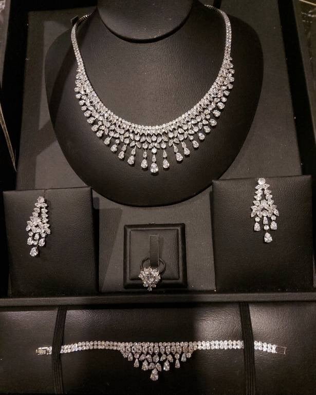 طقم مصنع من الزركون عالي الجودة ومرصع بحبات الكريستال اللماع ، لمظهر جذاب وفق أحدث صيحات دور الموضة العالمية .